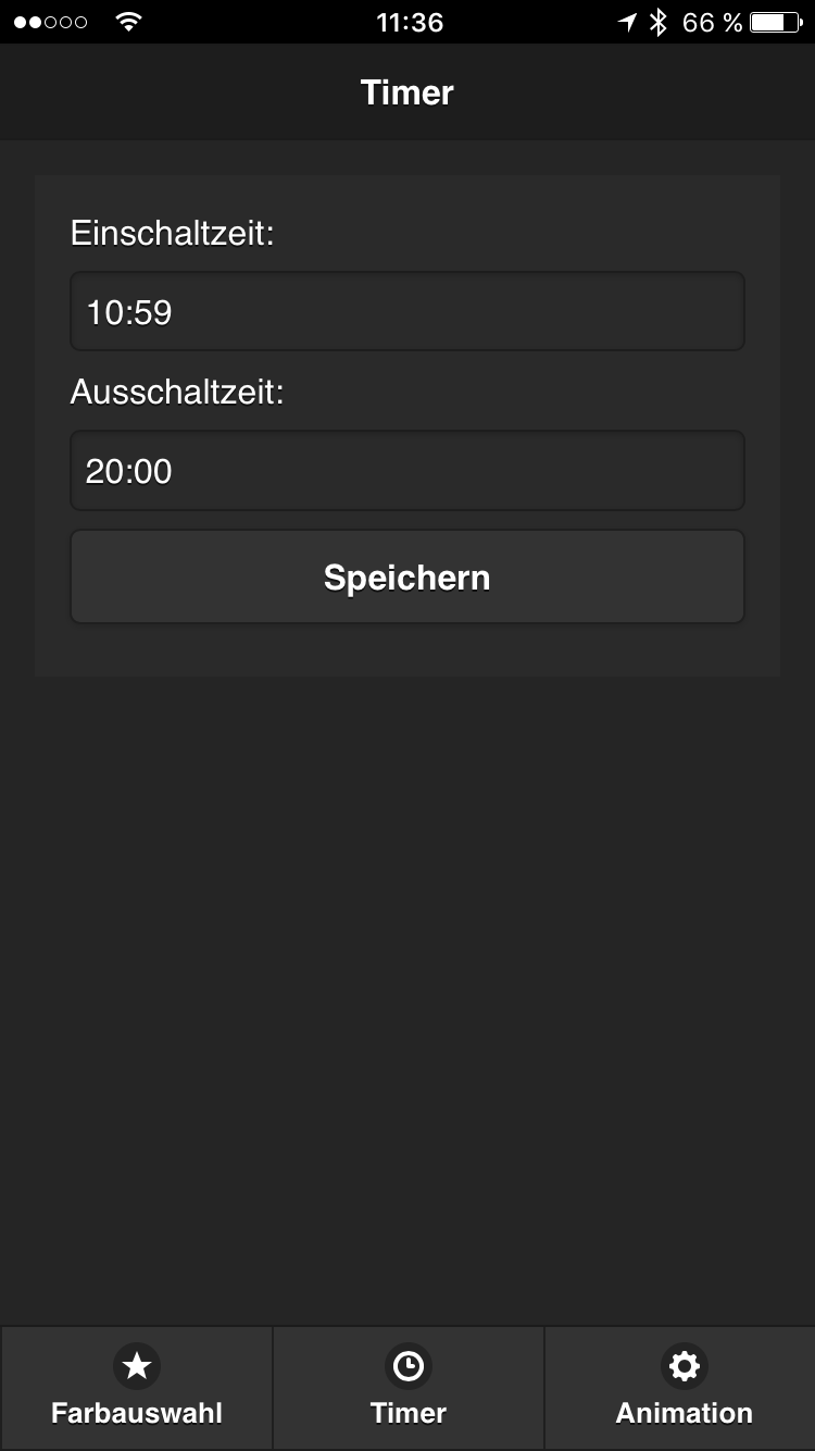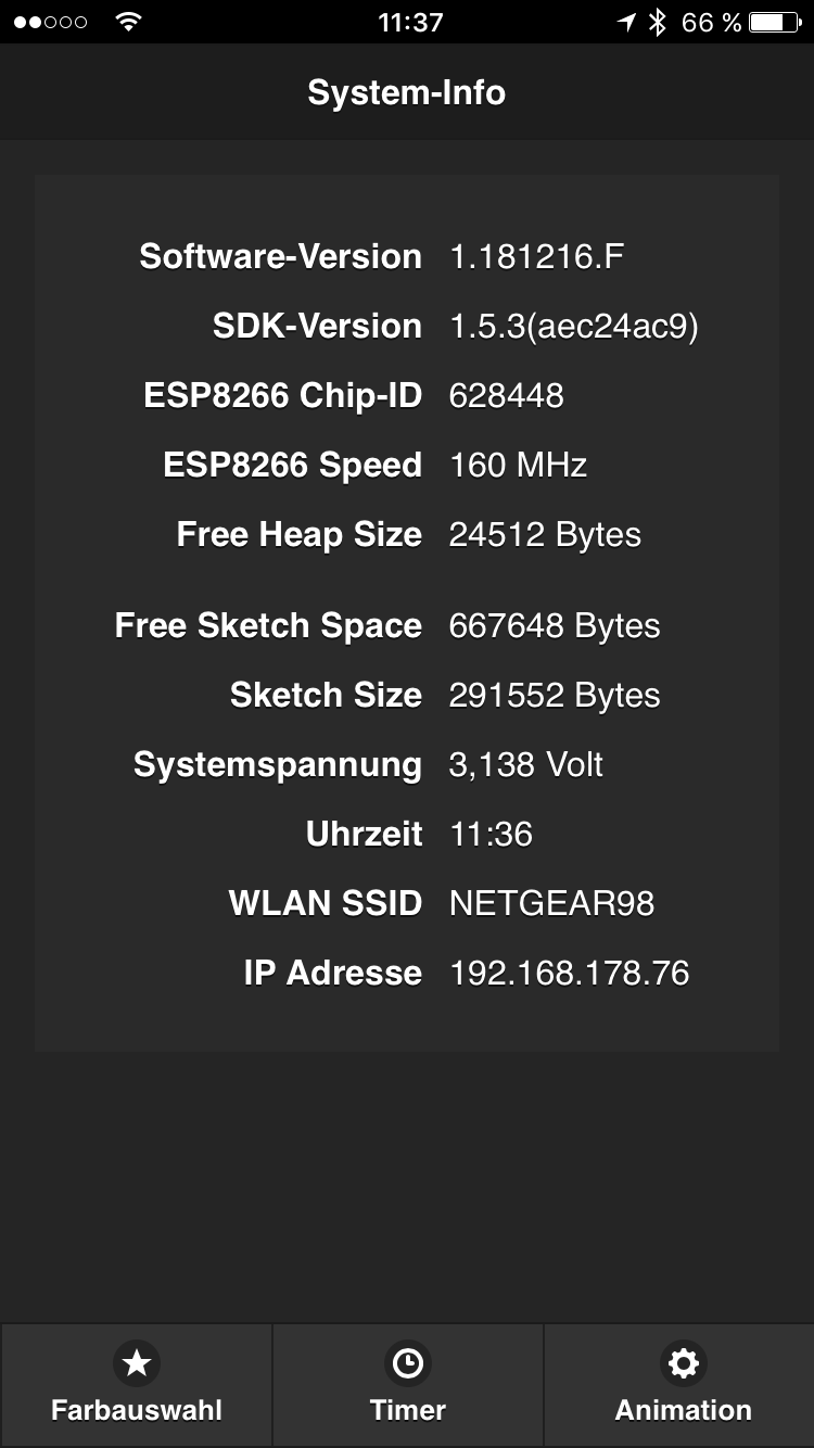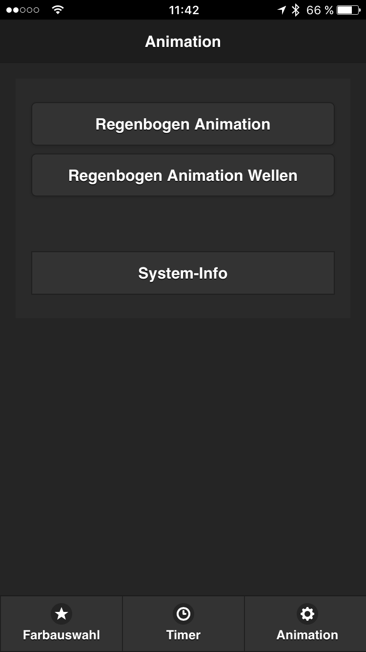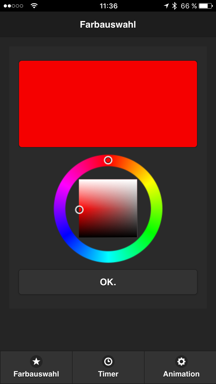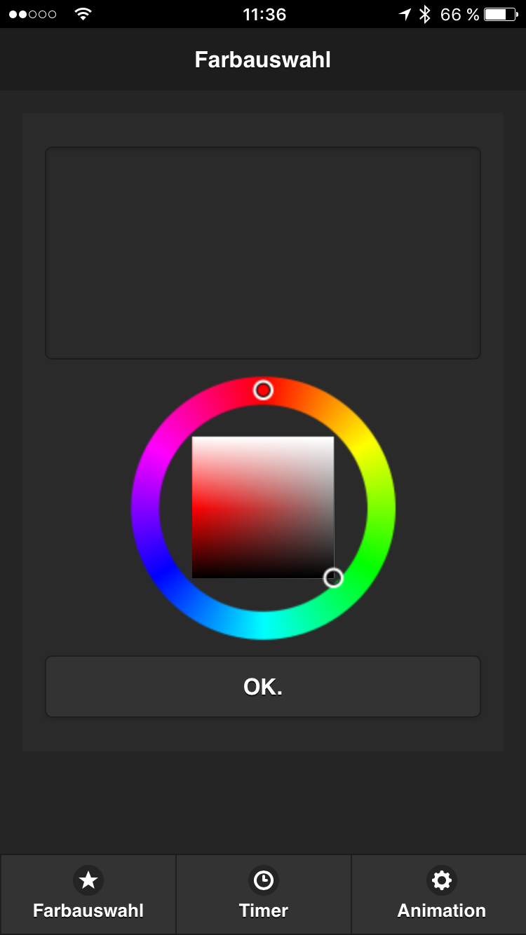 Auf dem Reiter "Farbauswahl" kann über das Farbrad eine Farbe gewählt werden. Eine Vorschau der gewählten Farbe wird im oberen Bereich angezeigt. Mit dem Button "OK" wird die Farbe an der Acryl LED angezeigt. Der Reiter "Timer" steuert die Ein- und Ausschaltzeiten der Acryl LED. Im Reiter "Animation" können zwei verschiedene Farb-Animationen aktiviert werden. Zusätzlich können Systeminformationen abgerufen werden.