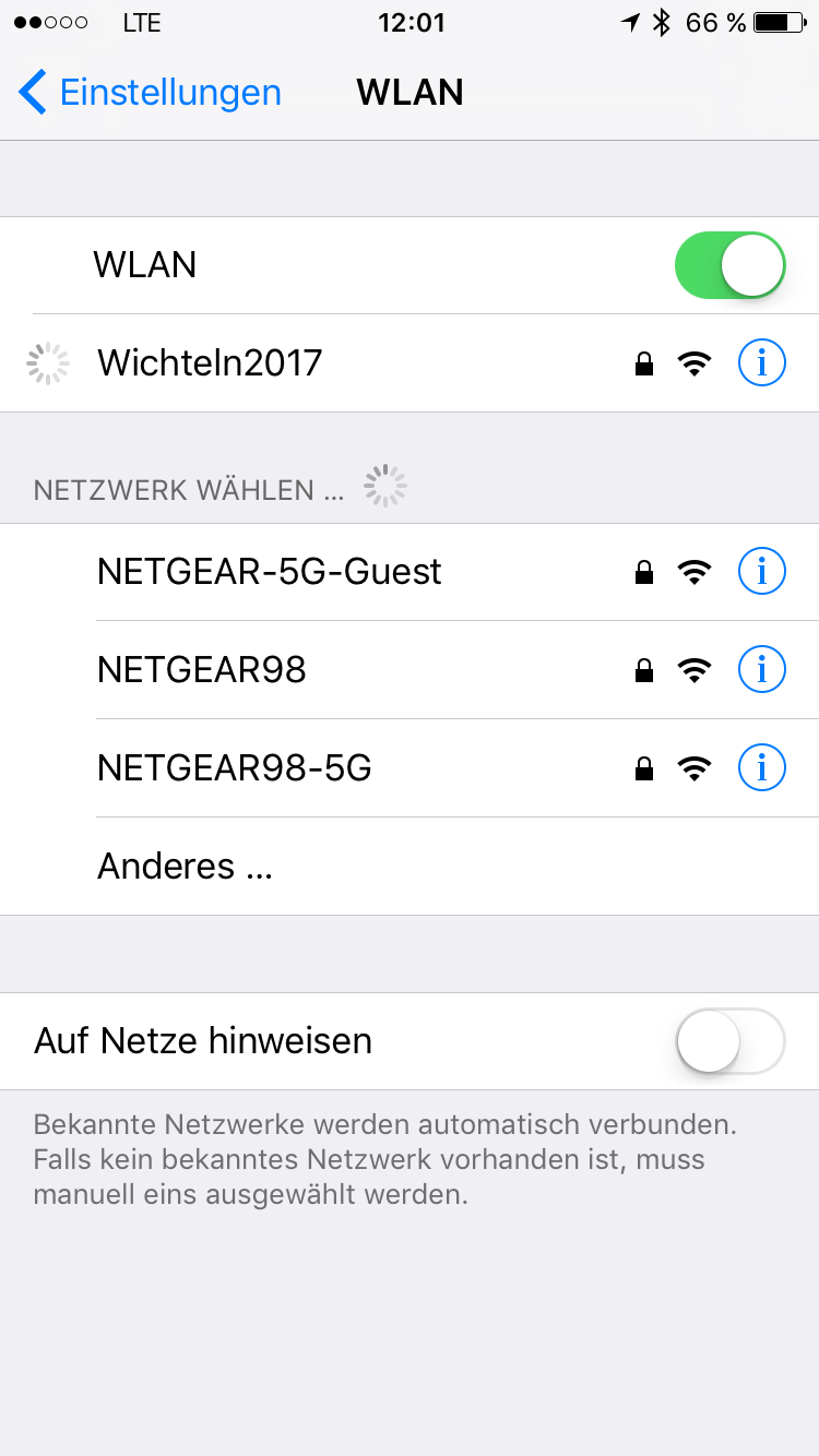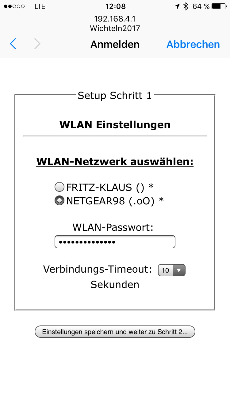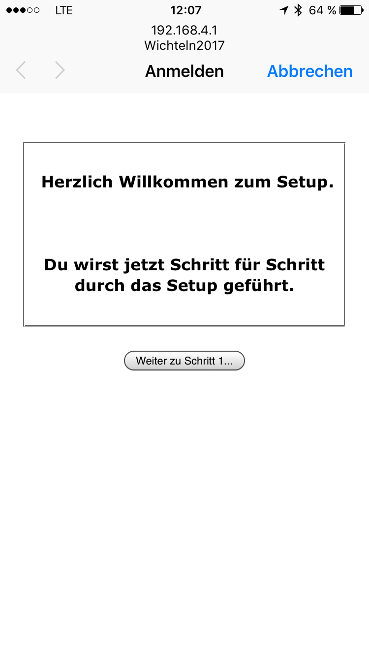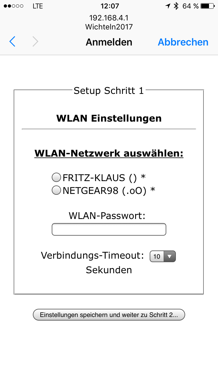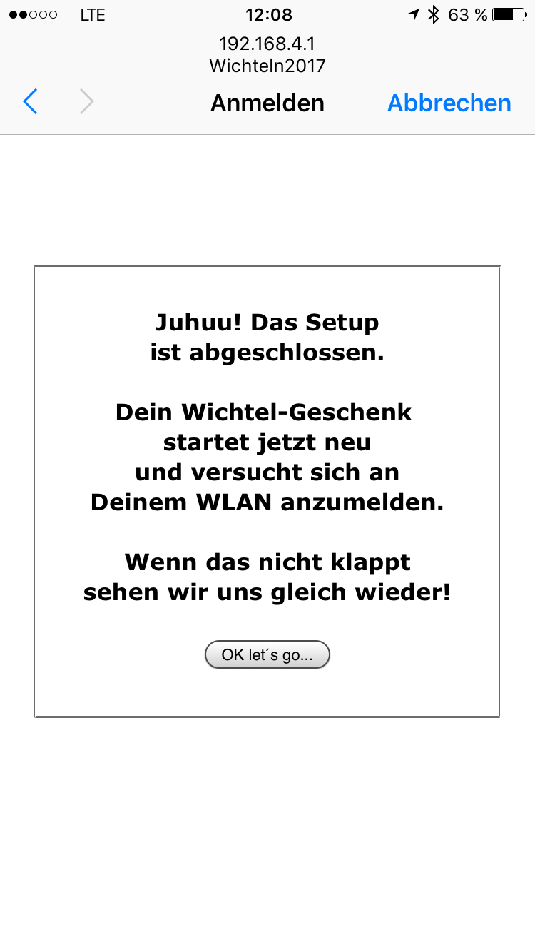 Bei Starten des Acryl LED-Programms wird zunächst versucht, sich an einem bestehenden (zuvor eingerichtetem) WLAN anzumelden. Funktioniert das nicht, wird selber ein Access Point (hier "Wichteln2017") aufgebaut. Verbindet man sich mit diesem Access Point, wird automatisch ein Einrichtungsassistent (Captive Portal) gestartet.